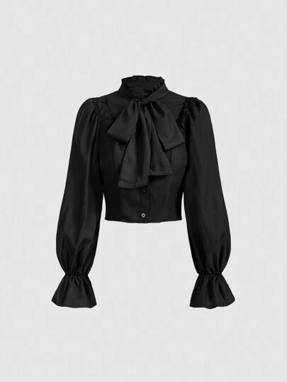 SHEIN MOD Black Ruffled Long-Sleeved Shirt With Big Bow - Black - View 1