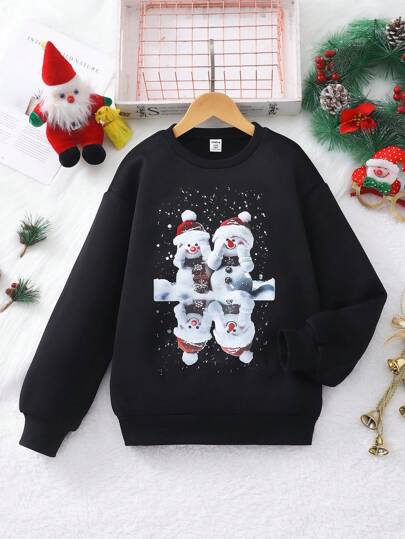 Tween Girl Christmas Snowman Print Sweatshirt - Black - View 1