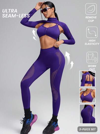 Innovista Women's High Elastic Seamless Sports Sets 3pics, Three Piece Set, Women Workout Leggings,Gym Woman Tees,High Elastic Support Sports Bra,Gym Set,Fall Winter Women Outfit ,Outdoor,Skiing,Gym Clothes,Purple,Running Work Out - Purple - View 1