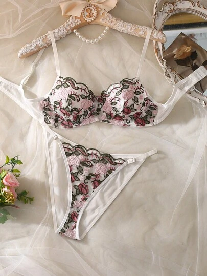 Floral Rose Embroidered Lace Romantic Countryside Lingerie Set - Multicolor - View 1