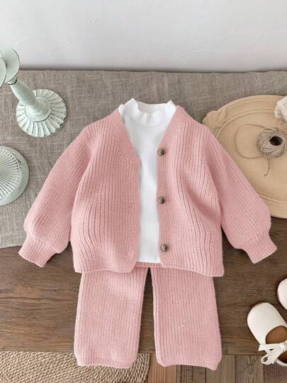 SHEIN LMoss Kids LMoss 2pcs/Set Baby Girl Cardigan And Wide-Leg Pants Outfit, Lantern Sleeve Sweater Set, Suitable For Outdoor, Shopping, Party And Other Occasions, Autumn/Winter - Pink - View 1