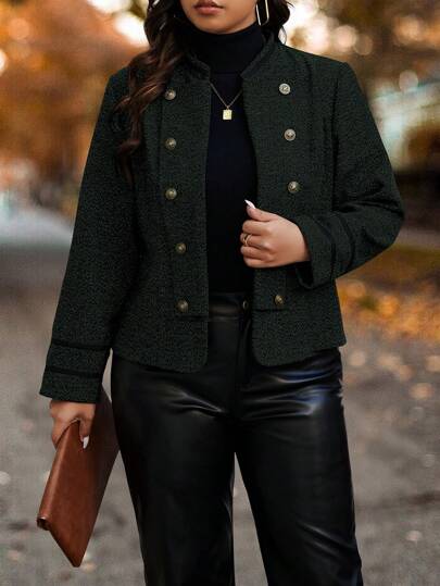Celure Women Plus Size Metal Button Decor Long Sleeve Casual Jacket, Autumn - Dark Green - View 1