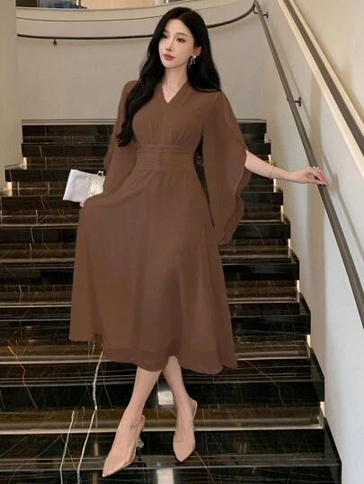 DAZY Solid Color V-Neck Pleated Chiffon Mid-Length Dress For Women, Homecoming, Birthday ,New Year Eve Prom Dress,Fall Clothes Long Sleeve Dress - Brown - View 1