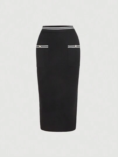 SHEIN MOD 1pc High Waist Color Block Pocket Bodycon Knit Skirt In Black,Fall/Winter Sweater Skirts,Festival Skirts,New Year Eve,Thermal Skirts,Preppy Skirts,Elegant Skirts,Professional Clothes,Business Casual Women - Black and White - View 2