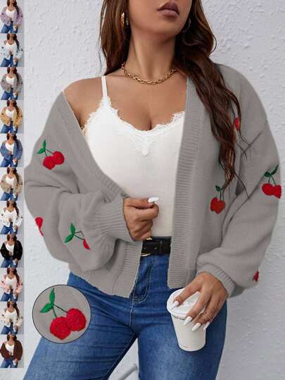 Flirla Plus Size Women Apricot Cherry Embroidered Lantern Sleeve Off Shoulder Casual Knitted Cardigan, Suitable For Autumn/Winter - Grey - View 1