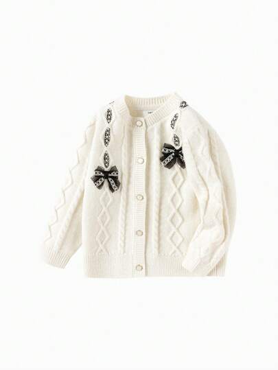 Balabala Girls' Knitted Cardigan Bow Decor Sweater, Stylish Autumn/Winter Top - Beige - View 1