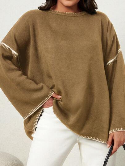 EURMUSE Plus Size Colorblock Trim Round Neck Long Sleeve Simple Casual Blouse - Camel - View 5