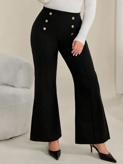 RueChic Plus Women's Double Breasted Button Decoration Flared Pants - Black - View 1