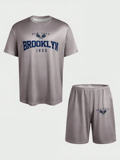 Men 2 Pcs Set Casual Letter Print Round Neck Short Sleeve Top And Shorts Pajamas - Multicolor - View 1