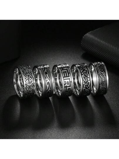 5 Pcs/Set Vintage Stainless Steel Men's Ring Set, Wisteria & Wave Patterns - Ring 5-piece Set - View 1