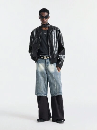 Manfinity VCAY Men Street Fashion Black Faux Leather Zip-Up Long Sleeve Jacket, For Fall Winter - Black - View 1