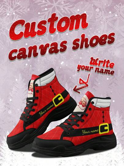 Men's Christmas Canvas Shoes, Christmas Belt Designed Lightweight Comfortable Soft Bottom High Top Sneakers For Man, High-Top Skateboard Shoes, Personalized Fun Christmas Gift For Mom/Dad/Her/Him/Girlfriend/Boyfriend/Wife/Husband/Friend - Black - View 1