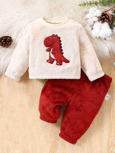 SHEIN 2pcs Baby Boy Cute Dinosaur Embroidery Print Flannel Long Sleeve Top And Long Pants Sleepwear Set, Autumn/Winter - Red - View 1