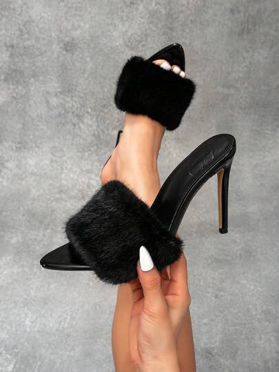 CUCCOO SZL Women's Sexy Fashion Furry Pointed Toe Stiletto Heel Casual Versatile Mule Shoes, Black Fluffy Comfortable High Heel Sandals For Christmas Party For Christmas And New Year Holiday Vibe Fall And Winter Valentines - Black - View 1