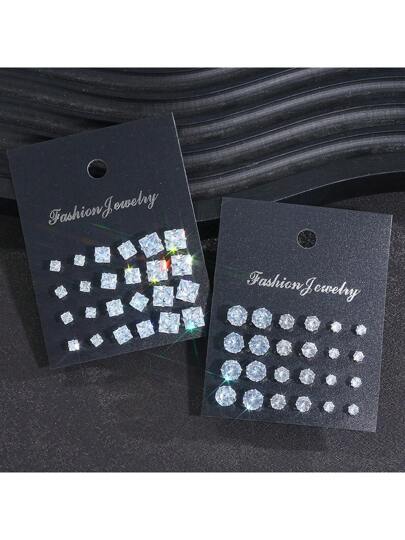 48pcs/Set Fashionable Minimalist Bling Bling Sparkling Square & Round Geometric Stud Earrings Set, Unisex Design For Holiday Party, Date, Daily Wear, Best Gift Choice For Halloween, Christmas, Valentine's Day, Mother's Day,Mom,Mother,Mother's Day,Gift - Silver - View 1