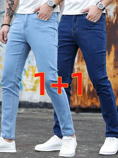 2 Packs Men's Blue Stretch Skinny Jeans Slim Long Casual Pants Washed Light Blue Jeans Solid Color Casual Street Style Fashion Versatile - Multicolor - View 1