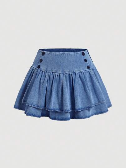 SHEIN MOD Plus Size Blue Denim Pleated Mini Skirt, Casual Fitting - Medium Wash - View 1