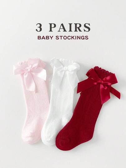 3 Pairs Of Adorable Bow Knee Baby Toddler High Socks For Girls - Hand Wash Only, Polyester Blend, Newborn Suitable - Multicolor - View 1