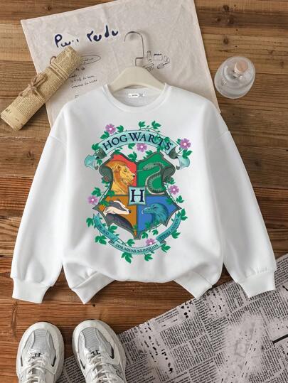 HARRY POTTER X SHEIN Tween Girl Casual Graphic Print Long Sleeve Crew Neck Sweatshirt, Suitable For Autumn/Winter - White - View 1