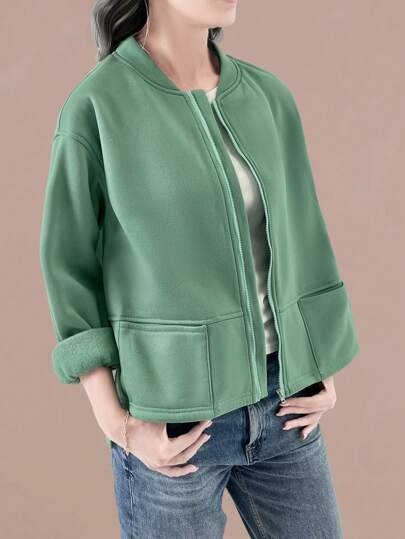 LanaWest Women Casual Loose Solid Color Fleece Jacket, Autumn/Winter - Green - View 1