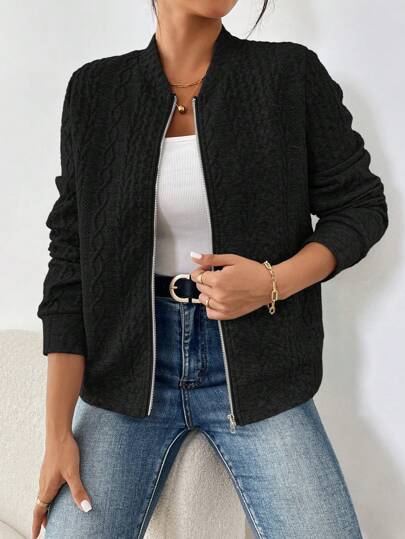 SHEIN LUNE Women's Sporty Bomber Jacket, Textured Fabric, Casual Comfortable Elegant Outerwear For Autumn/Winter - Black - View 1