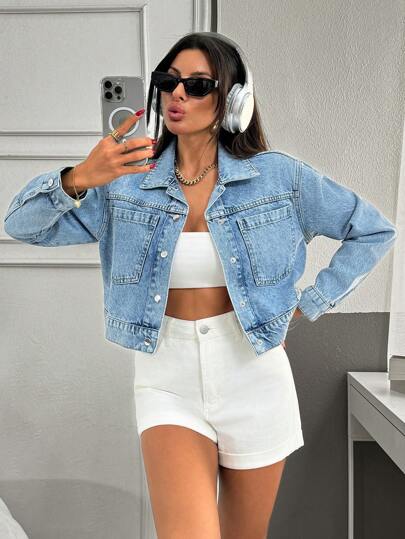 EURMUSE Women's Button Front Long Sleeve Pocket Simple Denim Jacket - Medium Wash - View 1