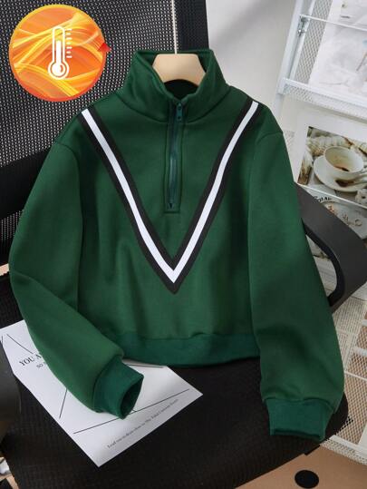 Girls Leisure Fashion Resort Fleece Ribbon V-Neck Half Zip Pullover Stand Collar Versatile Autumn/Winter Sweatshirt - Dark Green - View 1