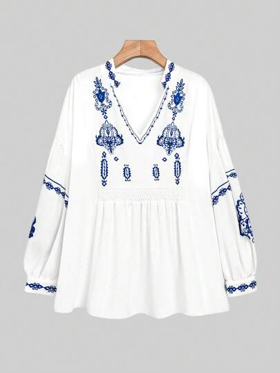 SHEIN LUNE Plus Size Women's Casual Loose Woven Shirt For Winter Fall Cloth For Women - Blue and White - View 1