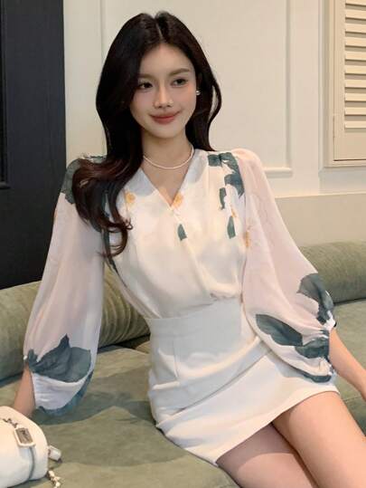 DAZY Women's Floral Print V-Neck Chiffon Loose Casual Long Sleeve Shirt - Apricot - View 1