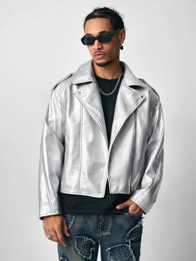 ROMWE MEN Street Life Men's Silver Fabric Casual Simple Leather Jacket With Front Buttons, Suitable For Autumn/Winter - Silver - View 1