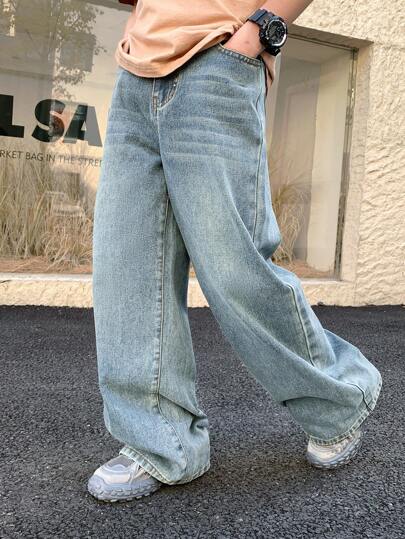 SHEIN Tween Boy Fashion Casual Vintage Blue Denim Simple Base Loose Comfortable Wide Leg Kids Jeans For Boy Soft Dailywear And Kids Summer Clothes - Blue - View 1