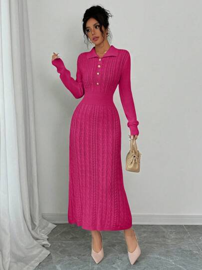 Chiquease Elegant Solid Color Waist-Cinched Long Sweater Dress For Autumn/Winter - Hot Pink - View 1