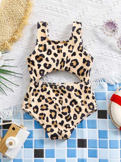 SHEIN Baby Girl Cute Leopard Print Hollow Knitted One-Piece Swimsuit, Summer - Camel - View 1
