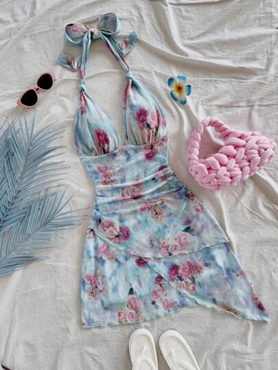 Soleia Women Vintage Rose Floral Tie-Dye V-Neck Backless Ruched Asymmetric Hem Romantic Mini Dress, Vacation Spring Break Outfit - Multicolor - View 1