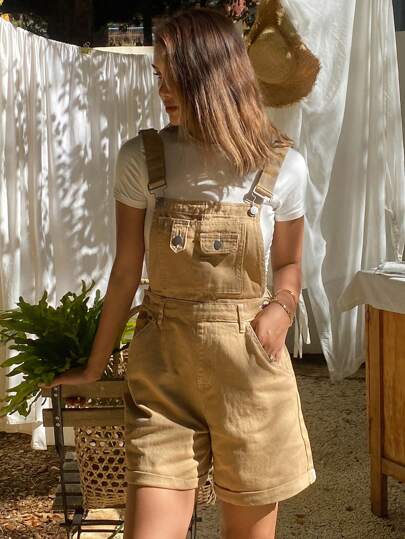 DAZY Women's Casual Solid Color Denim Bib Shorts - Khaki - View 1