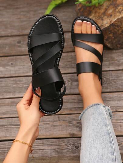European&American Style Summer Casual Comfy Women Flat Sandals, Round Toe Low Heel Beach Shoes - Black - View 1
