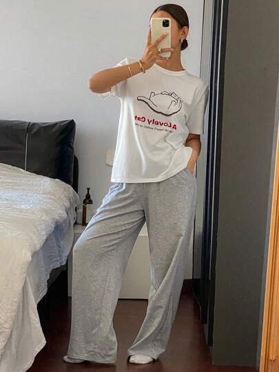 DAZY Cat Print Loose T-Shirt & Straight Sleepwear Pants Set - White - View 1