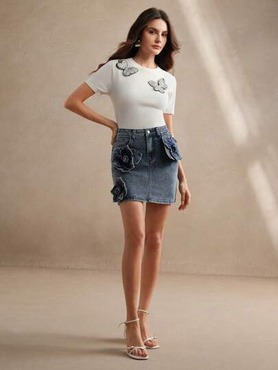 Anewsta Fashionable Floral Decorated Denim Skirt, Women Spring/Summer Outfits, Suitable For Valentine's Day - Blue - View 1
