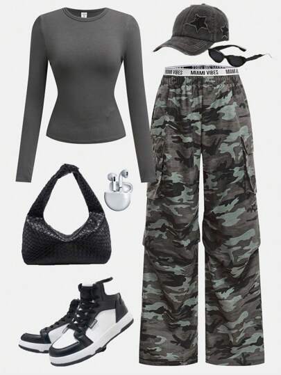 SHEIN Girlism 2 Pcs/Set Teen Girls Ribbed Long Sleeve T-Shirt And Camo Cargo Pants Set - Collegiate, Athleisure, Casual, Vintage/Boho, Fold Over - Grey - View 1