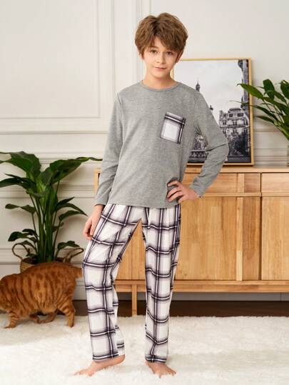 SHEIN Tween Boy Urban Casual Plaid Pattern Straight Pajama Pants And Round Neck Long Sleeve Pocket Graphic T-Shirt Loose Comfortable 2 Pieces Sleepwear Set - Grey - View 1