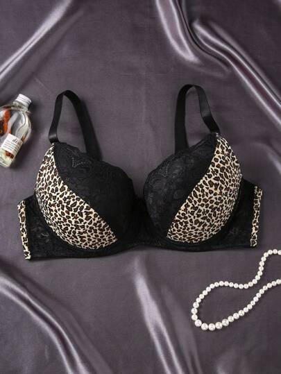 1pc Romantic French Lace Comfortable Minimalist Supportive Plus Size Leopard Print Bra Lingerie - Multicolor - View 1