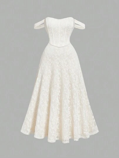 SHEIN MOD Plus Size Romantic Faux Fishbone Design One Shoulder Dress,Apricot Lace Bandeau Off Shoulder Uplift Long Dress,Dinner Outfit,Formal Dress,Prom Dress,, Dress, Bridesmaid Dress,Velvet Dress,Homecoming Dresses,Renaissance Dress,Vintage Dress,New Year,Valentine,Birthday Dresses For Women - Beige - View 4