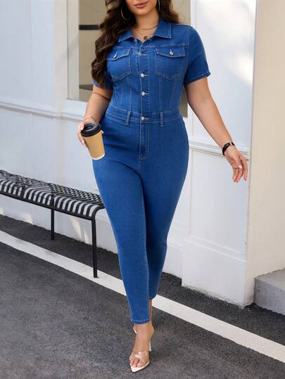 SHEIN Essnce Plus Size Solid Color Front Button, Pocket, Short Sleeve Denim Jumpsuit - Blue - View 1