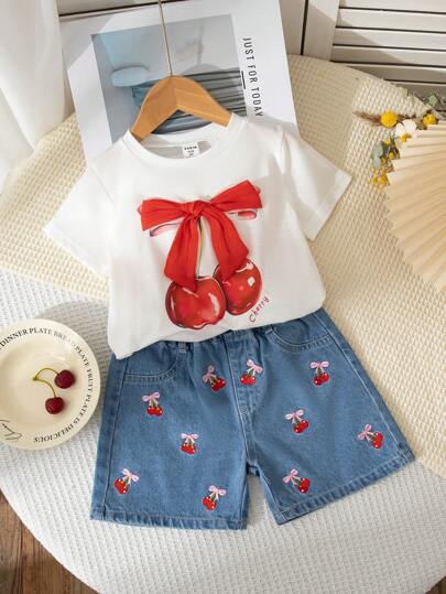 Souflis Souflis 2pcs/Set Toddler Girls Girhood Core Cherry Print Round Neck Short Sleeve T-Shirt And Denim Shorts With 3D Bow, Cherry Embroidery, Fashionable And Cute Summer Outfit - Multicolor - View 1