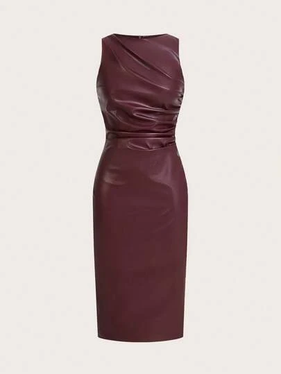 SHEIN Essnce Plus Size Women's Spring And Autumn Fashion Casual Elegant Sexy Wine Red PU Slim Sleeveless Dress,Curve Dress,Bodycon,Y2k Clothes,Birthday Outfits For Women,Western Clothes For Women,Valentine's Day - Burgundy - View 3
