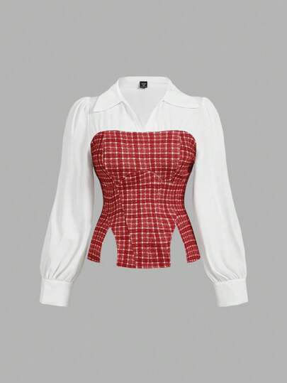 SHEIN MOD Plus Size Plaid Patchwork Asymmetrical Split Hem Crop Top Shirt, Elegant For Work - Burgundy - View 1