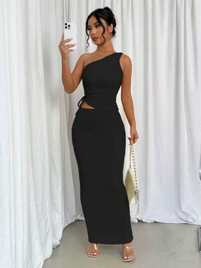 Selianne 2pcs/Set One Shoulder Cutout Drawstring Top And Skirt - Black - View 1