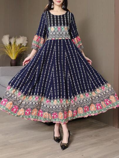 Style Bohemian Printed Embroidered Dress, Vintage Flowy Long Dress, Casual Holiday Beach Wear, Plus Size - Violet Purple - View 1