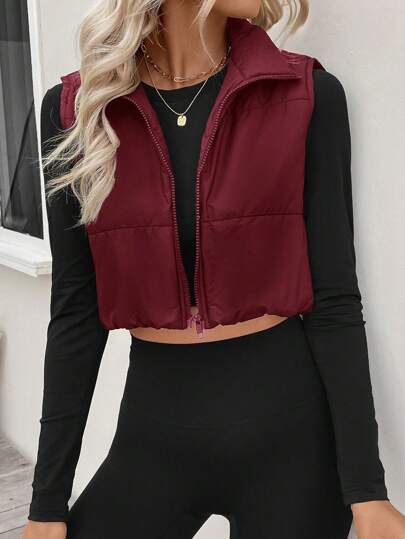 SHEIN LUNE Women'S Short Sleeveless Padded Vest, Ladies Late Fall Casual Zipper Funnel Neck Regular Fit Hot Pink Plain Women Padded Puffer Coats, Winter Clothes Warmth/ Winter Clothes Fashion - Red - View 1