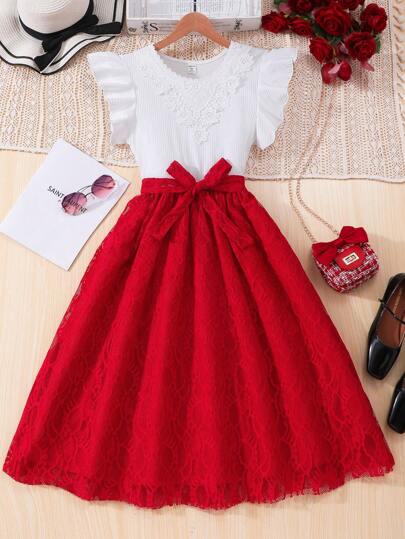 Teen Girl Knit Mesh Cap Sleeve Lace Splice Red Elegant Dress - Red - View 4